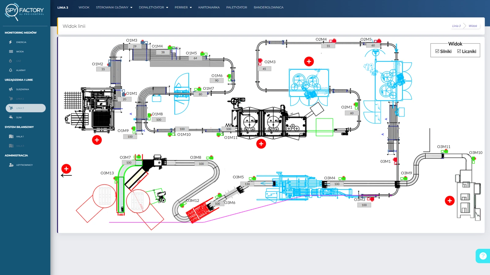 Na bazie otrzymanych layoutów odtwarzamy dokładnie wygląd linii oraz wszystkie obiekty produkcyjne, tak, aby użytkownik miał przejrzysty obraz obszaru objętego monitoringiem. Wspólnie z użytkownikiem określamy istotne KPI’s, podlegające ocenie i dostosowujemy oprogramowanie SPY-FACTORY do specyfiki zakładu produkcyjnego.